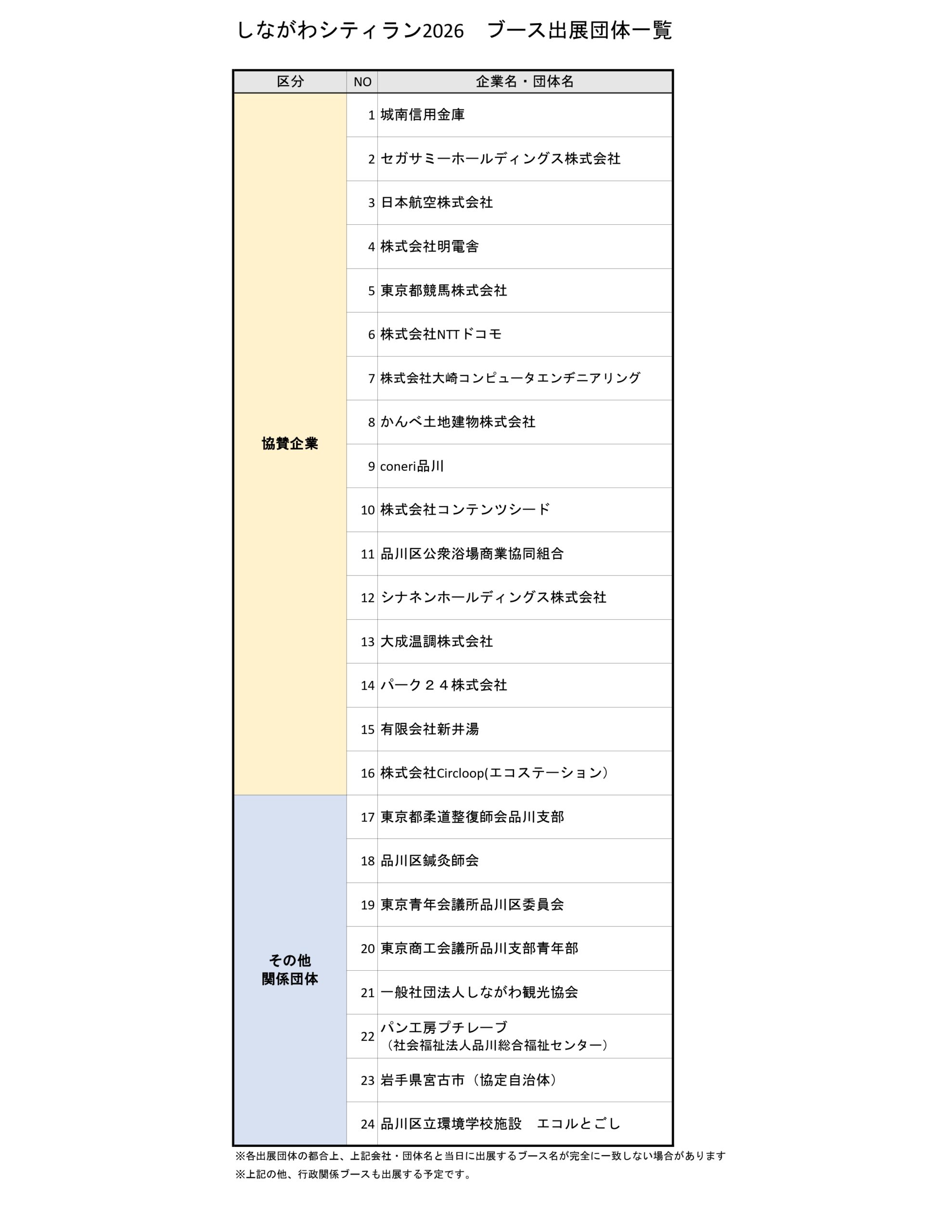 今年も大会を盛り上げていただく協賛企業のブースや出演団体が決定しました。 地域を代表する企業や地域団体等がメイン会場(大井競馬場)に出展します。