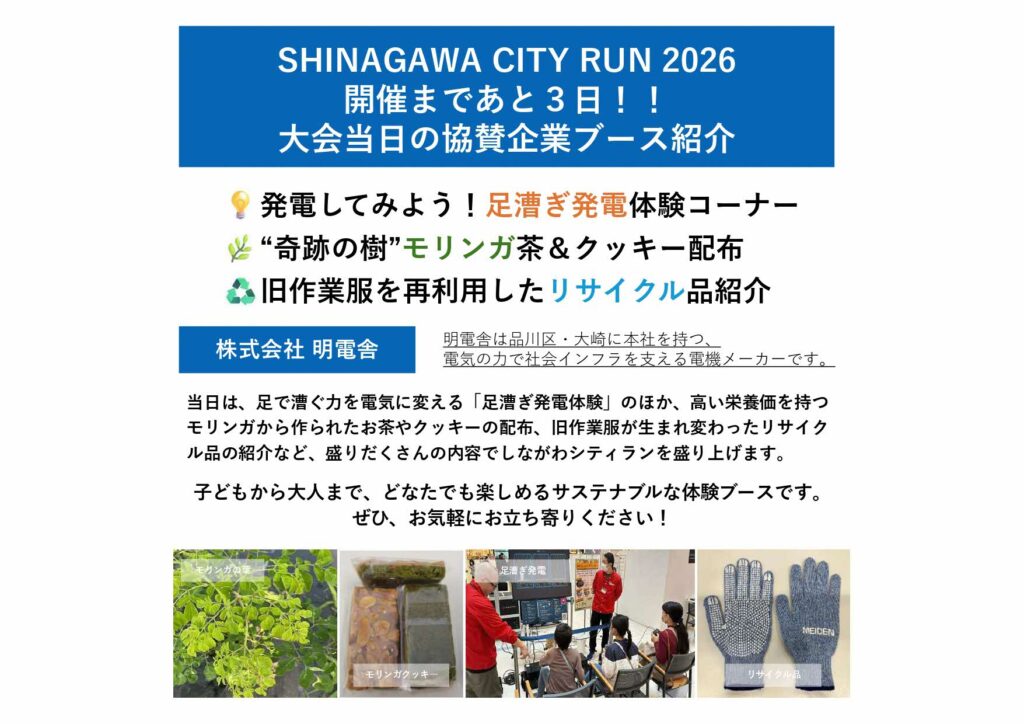 ・株式会社明電舎 ▶ 足漕ぎ発電トライアル、モリンガから作られたお茶やクッキーの配布、旧作業服が生まれ変わったリサイクル品の紹介などサスティナブルな体験ブース