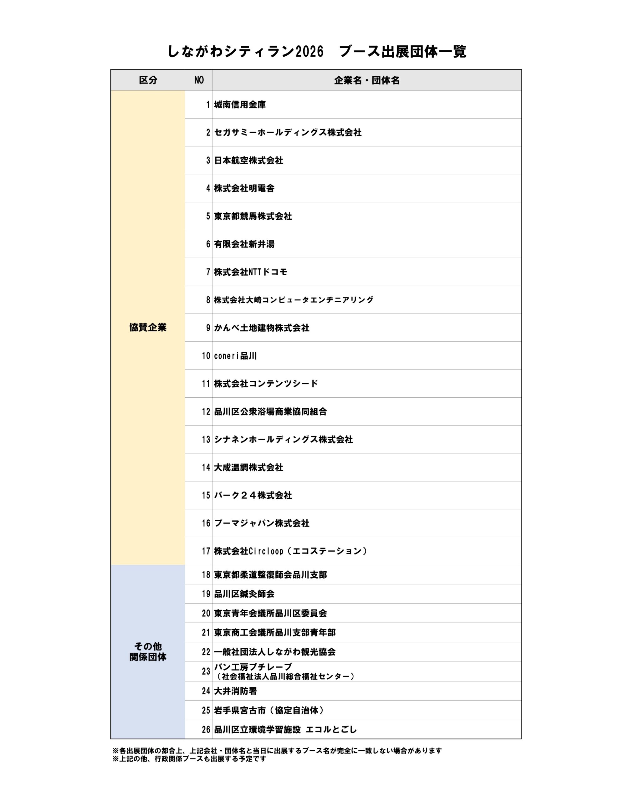 今年も大会を盛り上げていただく協賛企業のブースや出演団体が決定しました。 地域を代表する企業や地域団体等がメイン会場(大井競馬場)に出展します。